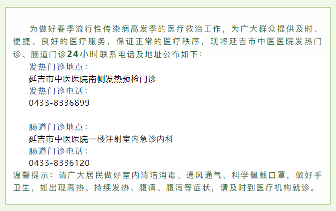 [통지] 연길시중의병원 발열 및 장질환 진료실 24시간 환자 접수