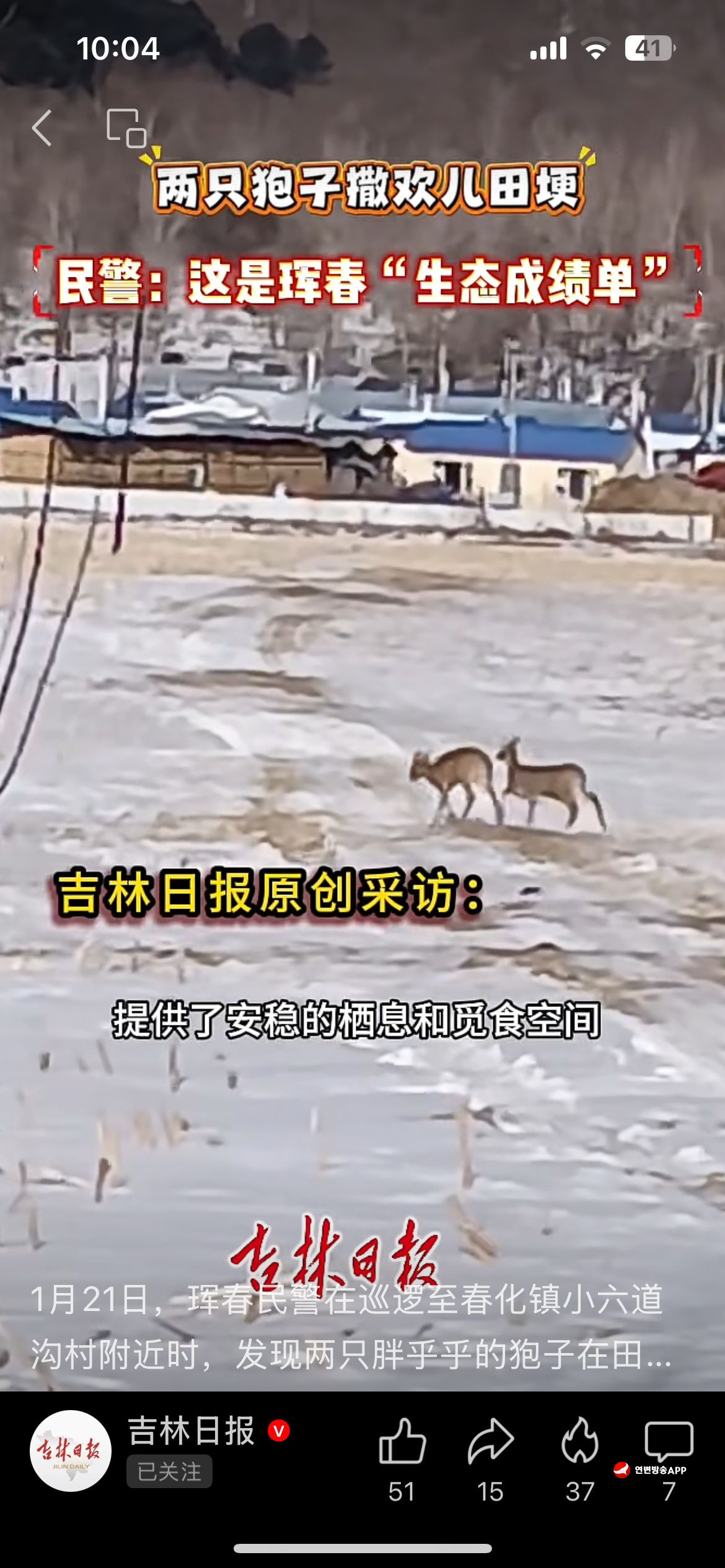 귀여워~! 마을앞 눈밭에서 노루 두마리 퐁당퐁당...