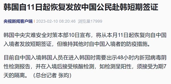 한국 중앙재난안전대책본부는 10일 이번달 11일부터 중국 입경자를 향해 단기비자 발급을 회복하지만 중국 입경자에 대한 기타 방역조치는 유지할 것이라고 선포했다.현재 중국에서 한국으로 입경하는 인원은 한국에 들어갈 때 48시간...
