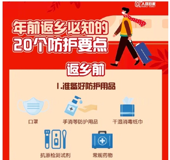 귀향 전과 후에 반드시 알아야 할 20가지 방호요점을 알아보자!귀향전1.방호용품을 준비해야 한다.마스크, 손소독제 등 방호용품, 휴지와 물티슈, 항원검사시제, 일상약물2.자신의 신체상황을 평가해야 한다.감염되지 않았거나 혹은...