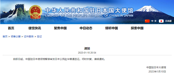 중국, 일본 공민의 중국 보통비자 심사발급 일시 중단