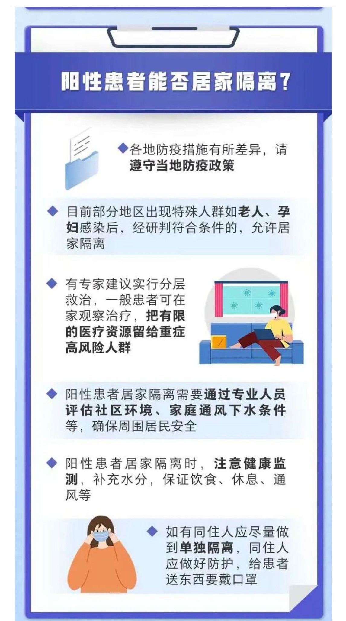 각지의 방역정책에 다소 차이가 있기에 당지 방역정책을 준수해야 한다.목전 부분적 지역에서는 로인, 임산부 등이 감염된 후 판단을 거쳐 조건에 부합되면 자가격리를 허락한다.일부 전문가들은 분류치료를 권장하고 있다. 일반환자는 ...
