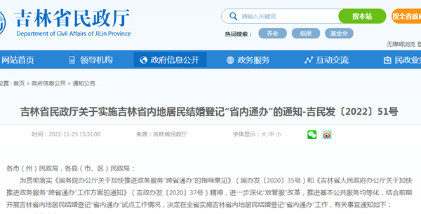11월 25일, 길림성민정청은 <길림성내 주민 혼인신고 ‘성내 일괄처리(省内通办)’ 실시에 관한 통지>를 하달하여 길림성내 주민 혼인신고 ‘성내 일괄처리’업무 실시에 대하여 포치했다.<통지>는 혼인신고 ‘성내 일괄처리’는 2...