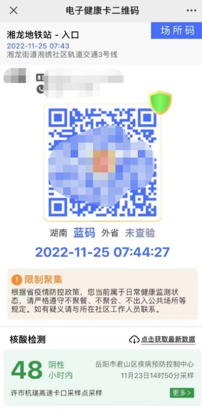 타성에서 호남으로 진입한 인원은 호남에 도착한 날로부터 5일내에 ‘호남성 주민건강코드’는 남색코드가 부여되고(붉은색, 노란색코드 제외), 팝업창 제시를 통해 ‘호남에 진입(귀경)한지 5일 미만’이라고 알린다.2.남색코드를 부...