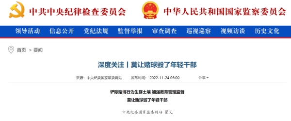 11월 24일, 중앙규률검사위원회 국가감찰위원회 사이트에는 <축구도박이 젊은 간부들을 망치게 해서는 안된다>라는 문장이 게재되였다.문장은 월드컵기간은 축구도박사기의 발생률이 높은 시기라고 지적했다. 현재 카타르월드컵이 한장인...