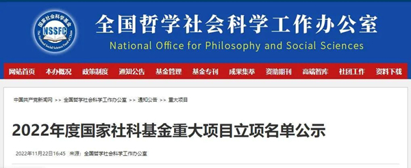 11월 22일, 국가철학사회과학사업 판공실은 <2022년 국가사회과학기금 중대학목 립항명단 공시>를 발표했다. 공시기간은 2022년 11월 22일부터 11월 28일까지이다.이번에 공시한 명단의 책임단위에는163개 교육 및 연...