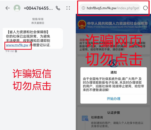 사기꾼들이 사회보장 부문을 사칭하여 발송하는 문자메시지 내용은 다음과 같다.“당신의 사회보험에 이상이 생겼다. 사용불능상태를 방지하기 위해 통지를 받은 즉시 xx사이트에 접속하여 등록인증하길 바란다.”사용자가 안내에 따라 정...