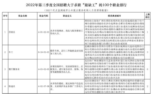 11월 1일, 중구취업양성기술지도쎈터는 ‘2022년 3분기 전국적으로 가장 일손이 부족한 100개 직종 순위’를 공포했는데 영업사원, 선반공, 식당 종업원, 택배기사, 청소원이 5위 안에 들었다.2분기와 비교할 때 제조업의 ...