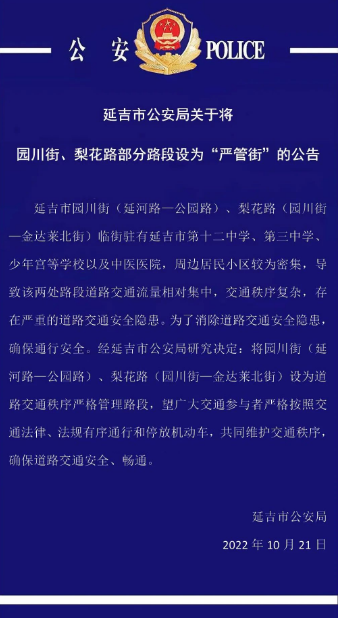 연길시공안국 공고연길시 원천가(연하로-공원로), 리화로(원천가-진달래북가) 연선에는 연길시제12중학, 제3중학, 소년궁 및 중의병원 등이 있고 주민구역이 밀집되였기에 교통류통량이 상대적으로 집중되고 교통질서가 복잡하며 일정한...