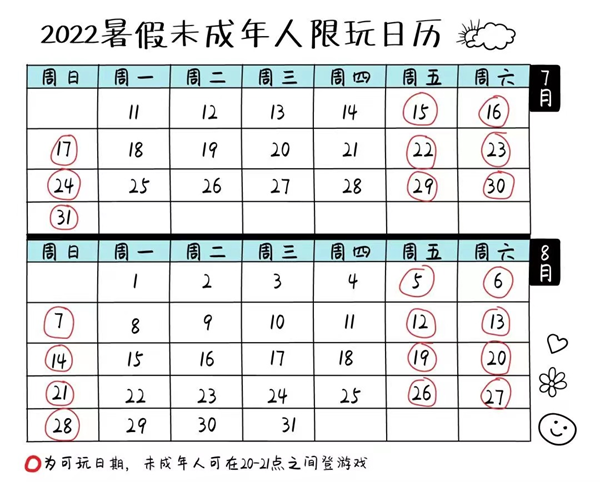 7월 11일, 텐센트게임은 <2022년 여름방학기간 미성년자 게임로그인달력>을 발표했는데 2022년 여름방학기간 미성년자는 금, 토, 일요일의 20시부터 21시까지만 게임을 로그인할 수 있다. 통계에 의하면 이번 여름방학기간...