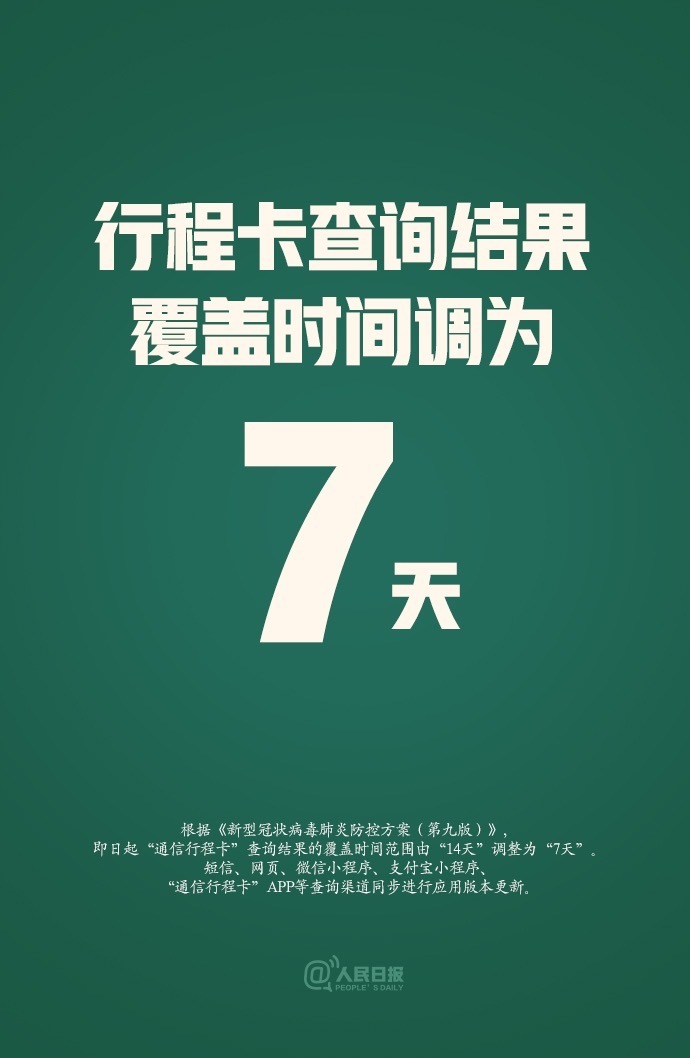 공업과정보화부는 공고를 발표하여 《신종 코로나 바이러스 페염 예방통제방안(제9판)》에 따라 오늘부터 통신행적카드 조회결과 시간범위를 14일에서 7일로 단축시킨다고 밝혔다.