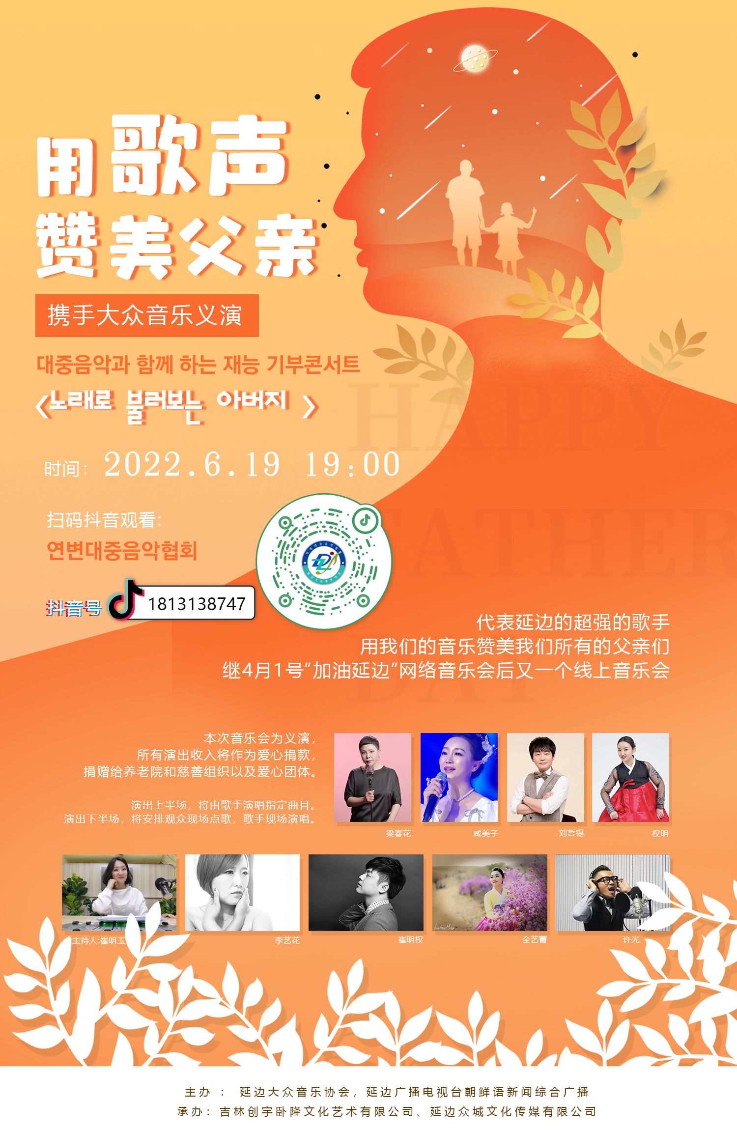 부친절을 맞으며 연변라지오조선어뉴스종합방송과 연변대중음악협회에서는 온라인 라이브자선콘서트 <아버지를 노래합니다>를 기획, 19일 19시부터 틱톡으로 생중계하게 된다.이는 지난 4월 1일에 펼쳐진 <봄날의 기다림- 연변 화이팅...