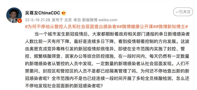 5월 19일 저녁, 중국질병예방통제센터 류행병학 수석전문가 오존우는 개인 웨이보에 장문의 글을 올려 왜 관리통제인원과 사회면으로부터 감염자가 속출하는지에 대한 화제에 대답했다.한 도시에 신종코로나페염 전염병상황이 발생한 후 ...