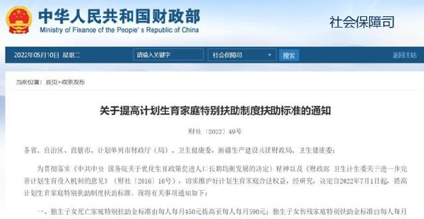 재정부, 국가위생건강위원회는 근일 통지를 발부해 2022년 7월 1일부터 계획출산가정 특별보조제도 보조표준을 향상시킬 것이라고 밝혔다.외동자녀 사망가정 특별보조금은 인당 매달 450원에서 인당 매달 590원으로 향상하고 외동...