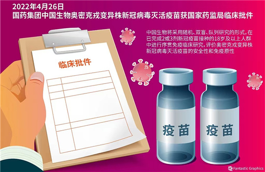 ‘중국생물’ 위챗계정의 소식에 따르면 5월 9일, 중국의약그룹 중국생물 북경생물제품연구소 오미크론변이주 신종코로나바이러스 비활성화백신 순차면역 림상실험이 호남성에서 가동되였다고 한다. 이는 5월 1일 중국생물 오미크론변이주 ...