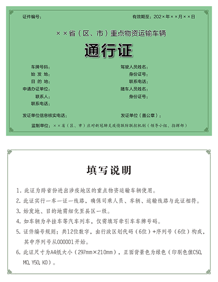 전국 통일 양식의 중점물자운송차량 통행증 공포