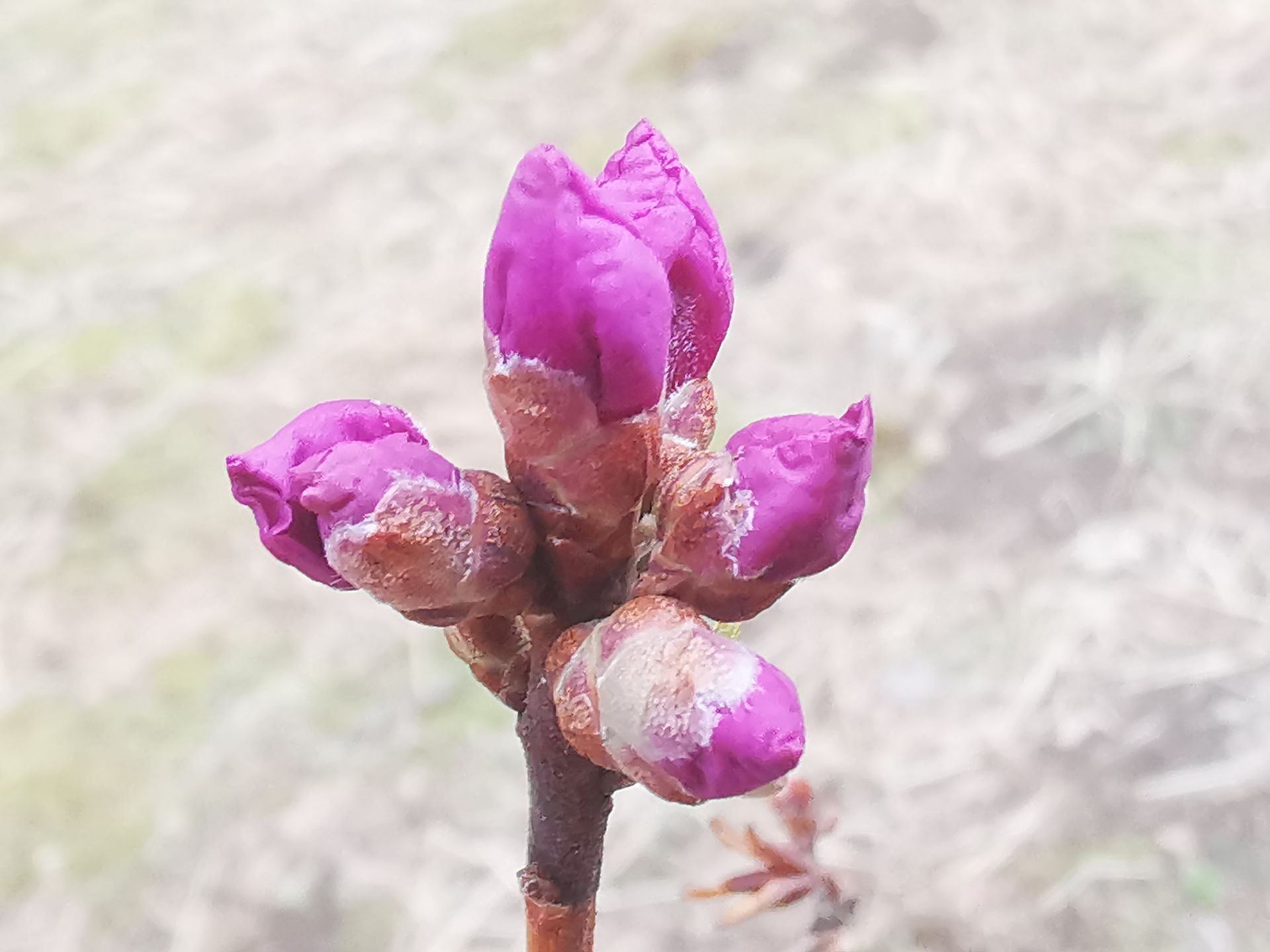 전염병의 시련속에서도 "봄의 선구자" 진달래는 어김없이 이쁜 꽃을 피우면서 봄소식을 전해주고 있다. 4월 12일 촬영사가 훈춘시에서 망울진 진달래를 촬영했다.