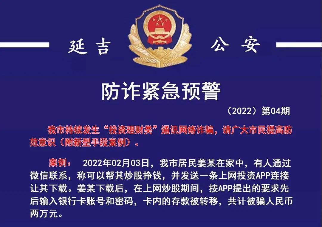 연길공안 사기방범 긴급 주의보!오늘 연길시공안국이 사기방범 긴급 주의보를 발부했다. 긴급 주의보는 요즘 연길시에서 ‘재테크투자 류형’ 통신 인터넷 사기가 지속적으로 발생하고 있기에 광범한 시민은 방범의식을 높이기를 바랐다.긴...