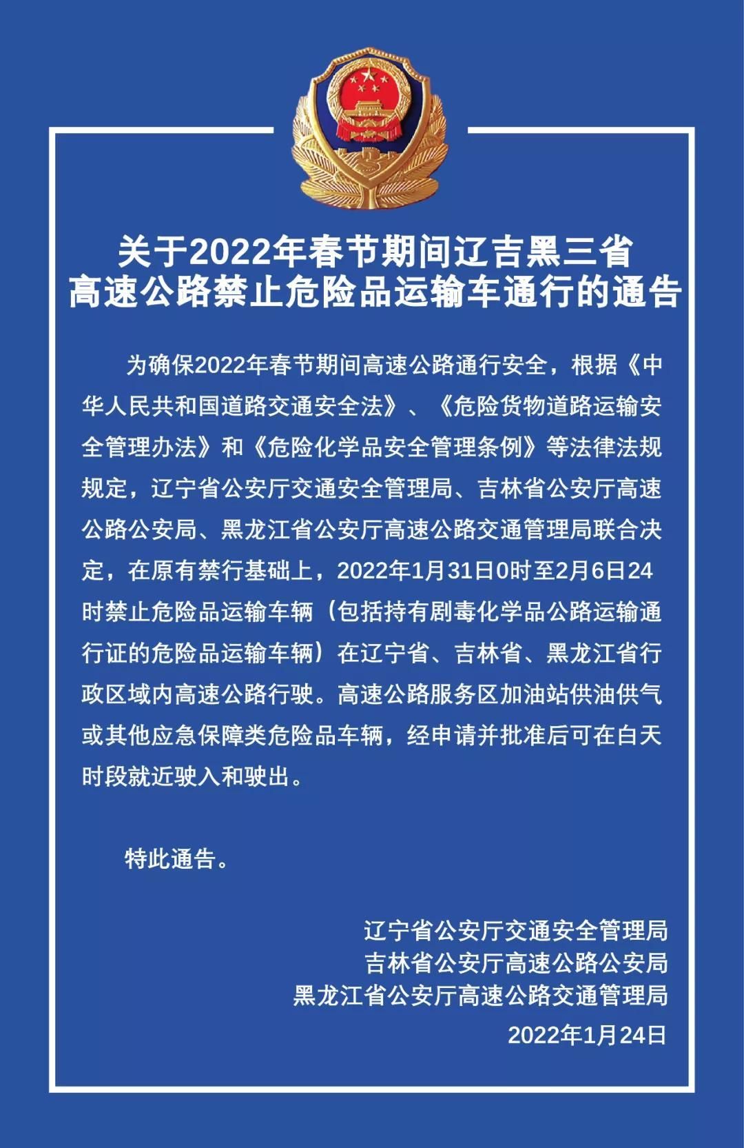 2022년 음력설기간 료녕, 길림, 흑룡강 3개 성 고속도로에서 위험품 운수차량 통행을 금지할 데 관한 통고2022년 음력설기간 고속도로 교통안전을 확보하기 위해 <중화인민공화국도로교통안전법>, <위험화물 도로운수 안전관리법...
