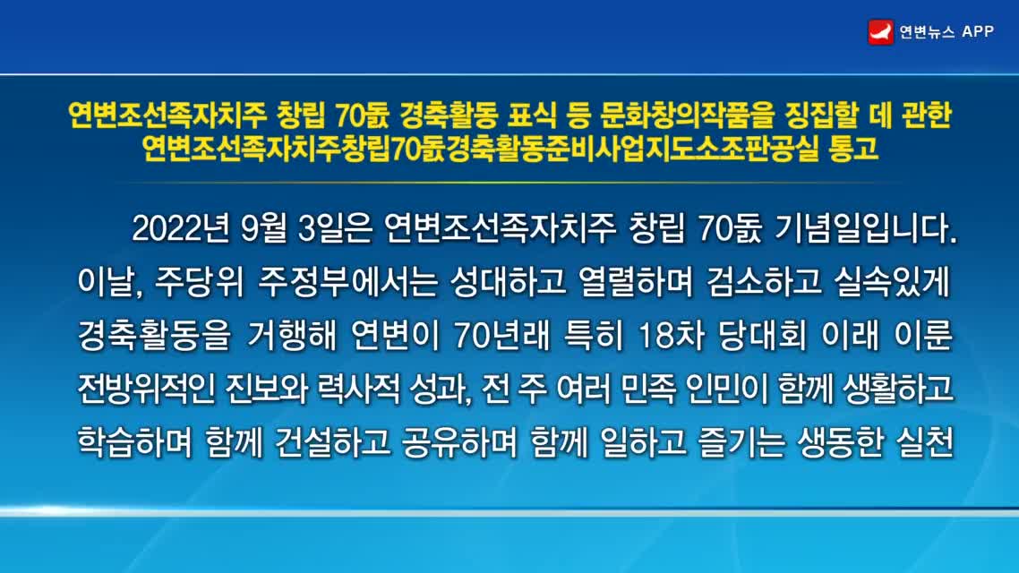 [영상뉴스] 연변조선족자치주 창립 70돐 경축활동 표식 등 문화창의작품을 징집할 데 관한 연변조선족자치주창립70돐경축활동준비사업지도소조판공실 통고