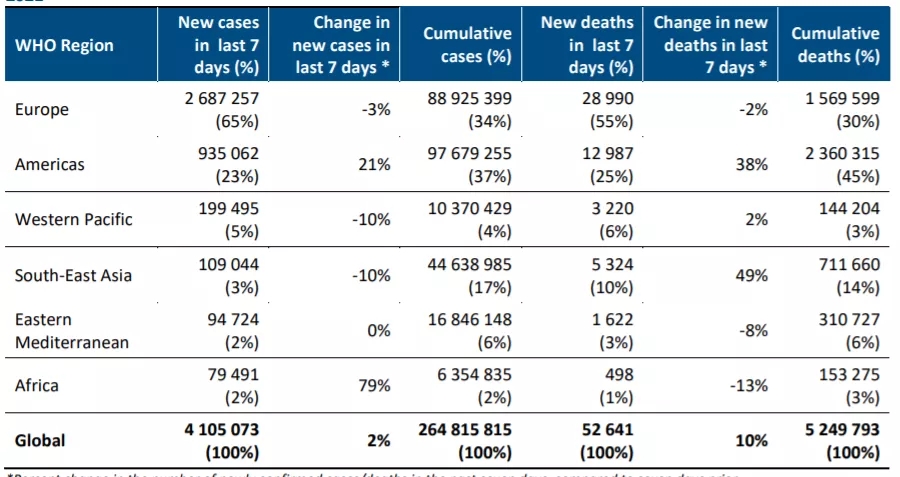 현지시간으로 7일, 세계위생기구는 신종 코로나 페염 주간 역학보고를 발부했다. 지난주 전세계 신종 코로나 페염 신규 확진병례가 410만례를 초과했으며 신규 사망병례가 5만 2000례를 초과했는데 신규 사망병례는 그전주보다 1...