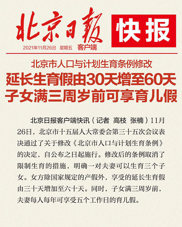 북경 출산휴가 연장! 최장 8개월 휴식할 수 있어!2021년 11월 26일 17